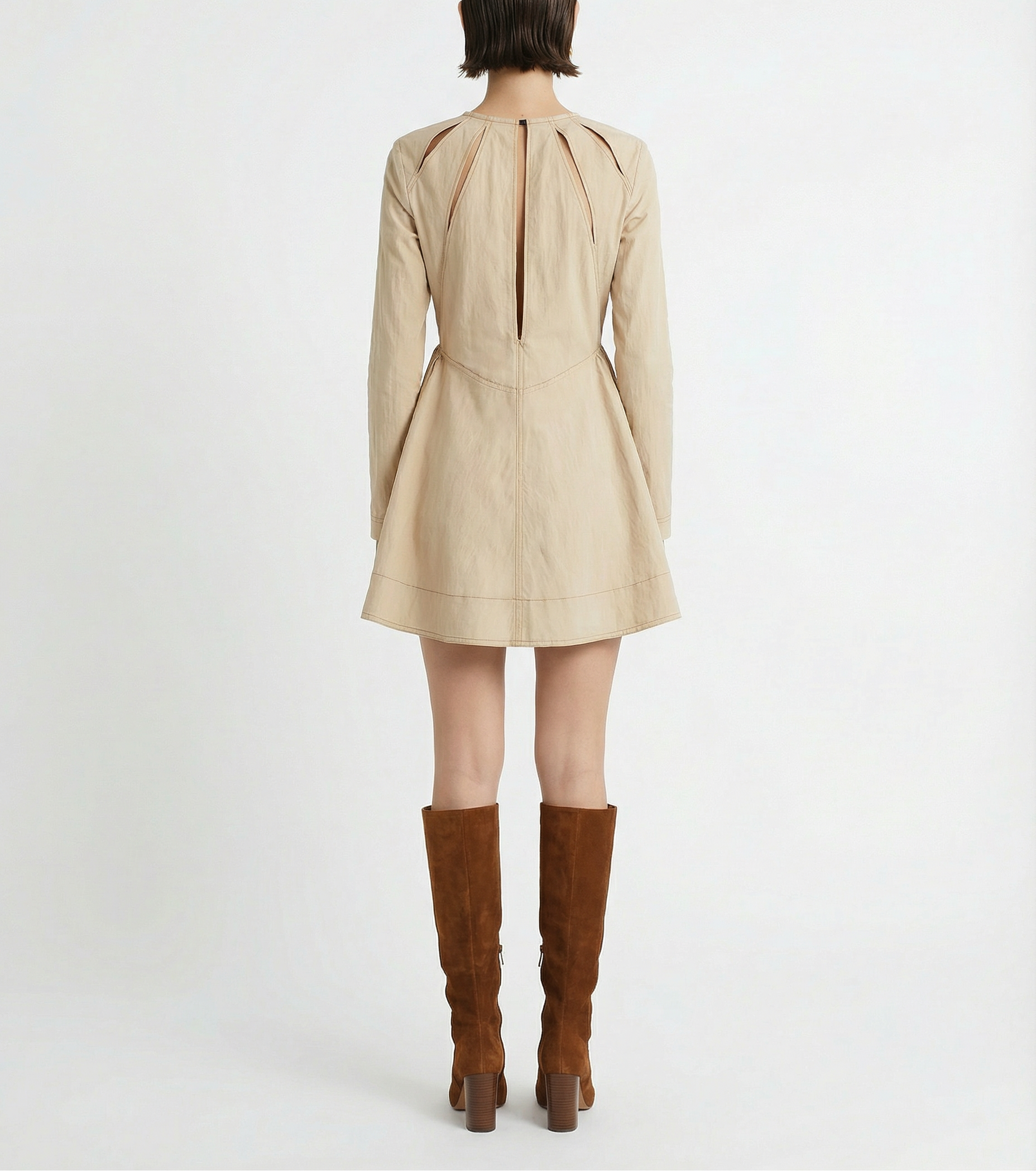 The Zoe Cutout Dress stands out with its chic back cutouts and sleek contrast details. The flared silhouette is a blend of easy, sexy, modern, and elegant. Its flattering lines and effortless shape enhance the body, making it a perfect choice for any occasion.