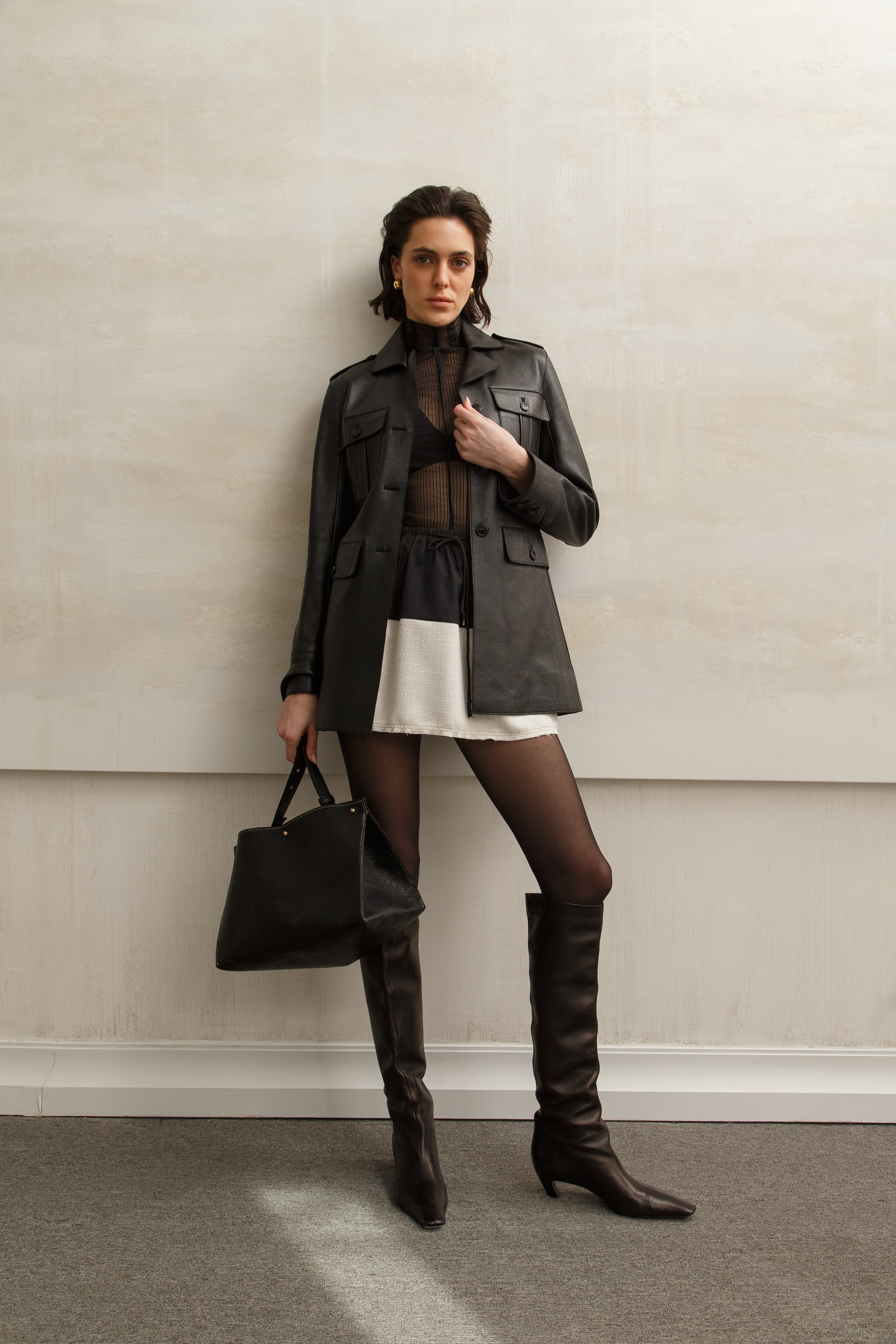 The Azura Jacket is crafted from supple black leather with a structured, utility-inspired design. Featuring four front flap pockets, epaulet details, and a sharp tailored cut, it strikes the perfect balance between polish and edge. A timeless layer that elevates both casual and evening looks.