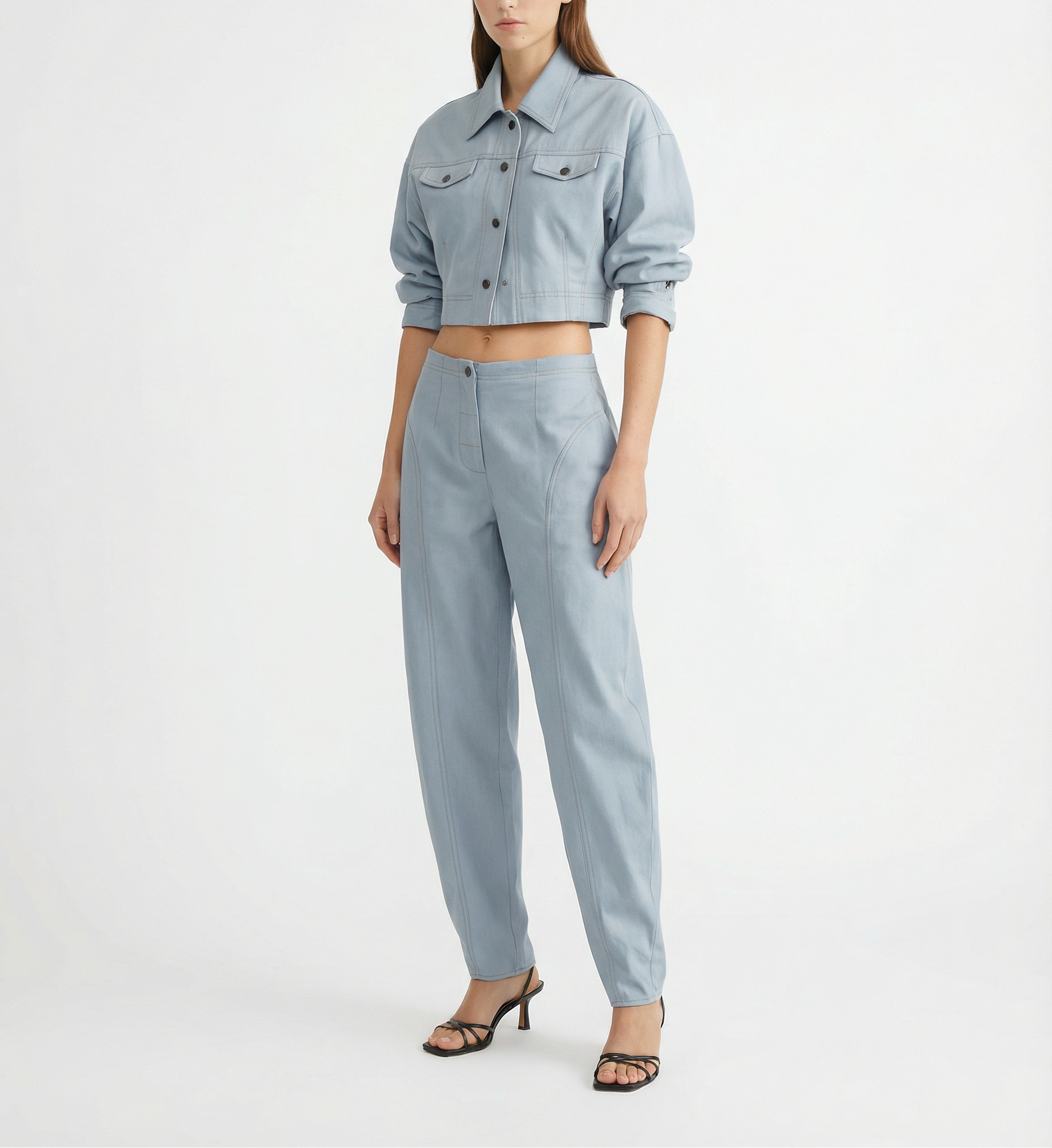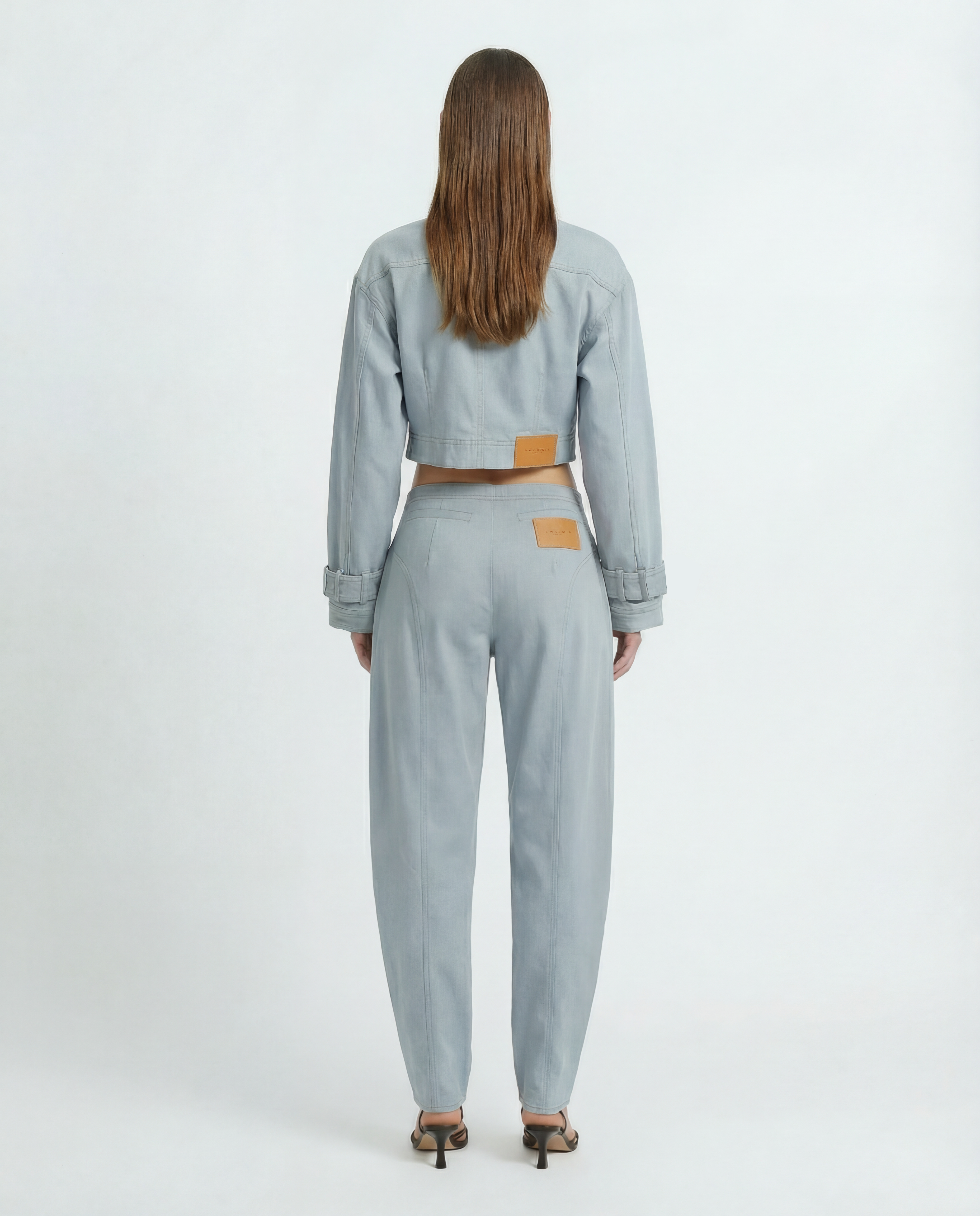 The Sombra Pant blends structure with ease. Designed in a barrel-leg silhouette, it features curved seam detailing, welt back pockets, and contrast stitching for a subtle edge. Its sculptural shape is balanced by a relaxed fit, making it a versatile piece that transitions effortlessly from day to evening.