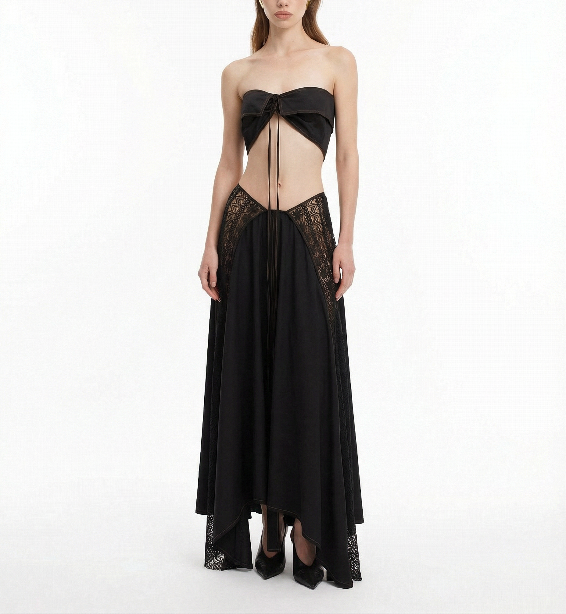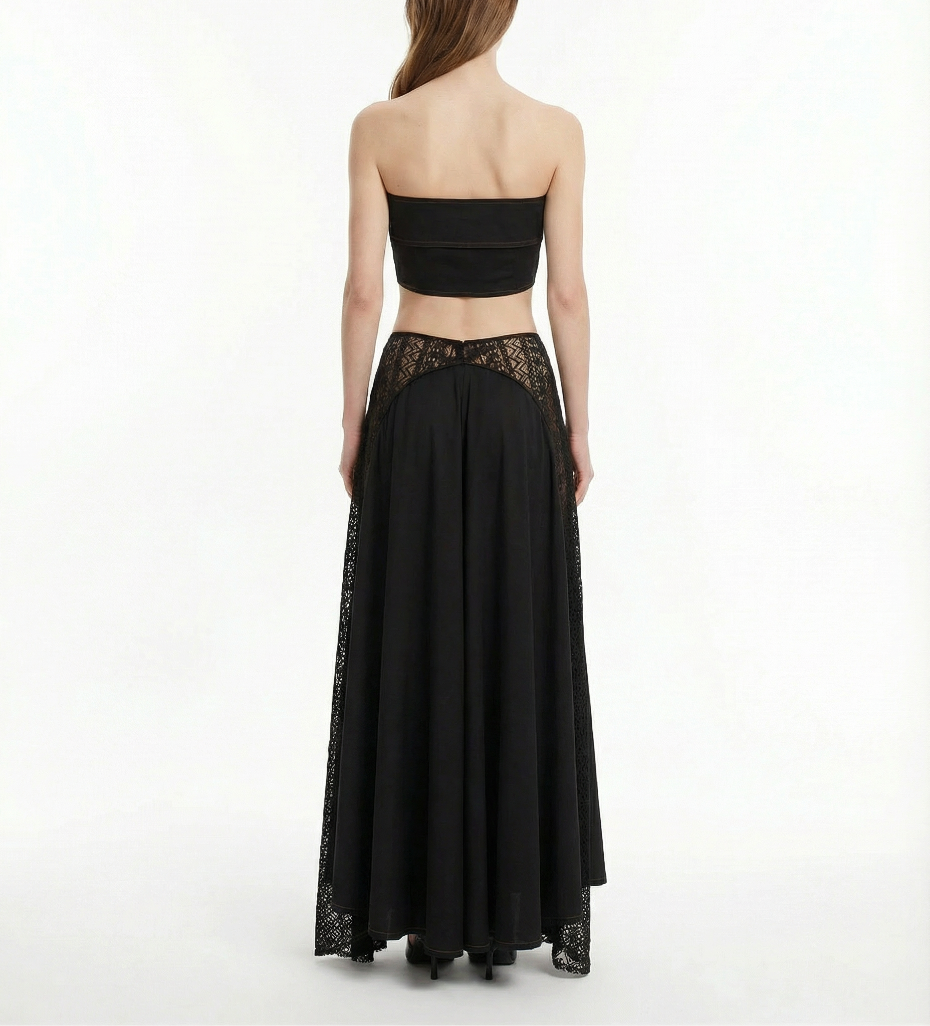 The Sola Skirt reimagines lace in motion. Designed with sculptural lace panels framed by black piping with contrast stitch, it flows into soft blush rayon for a fluid, asymmetric drape. A modern take on romance, this piece is meant to be styled with sheer tops or minimal knits for striking contrast.